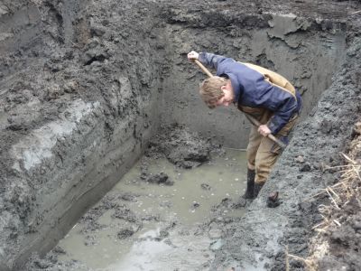 Wel dat ut un ondersoek was in opdracht fan de projektontwikkelaar. Ik maakte om 11.15 uur de foto’s. Nou un om 12.30 uur wurdt ut metersdiepe gat al wear dichtgoaid. Fòlgens Diependaal is de kaans klein dat der un belangrike argelogise fondst op ut terrein deen wurde sal. Ondertussen, bij myn weten, gyn nijs over eventuele húzebou op dit prachtege stekje in Sneek. Sien hierfoar o.a. myn blog fan 26 november 2011.