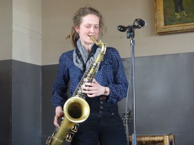 De middach, dy’t werklek omfliegt, wurdt afslúten deur de jonge súpermúzikale VWO-learlinge Anne Floor Hoitinga. Se singt eigen ( liefdes-) nummers met haar prachtech warme stem. Dat dêrbij de senuwen ( ‘ fuckfuckfuck…’ ) har deur ut gouden stròtsje fliege en de roaie flekken in de hals staan fergeve we har. Se staat der, su as al dy Snekers der fanmiddach stonnen! Sjapo!