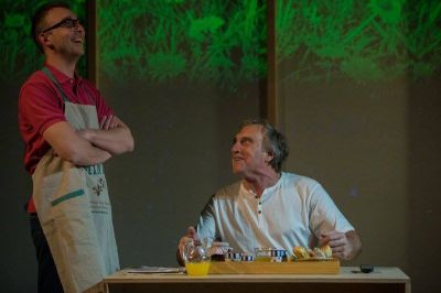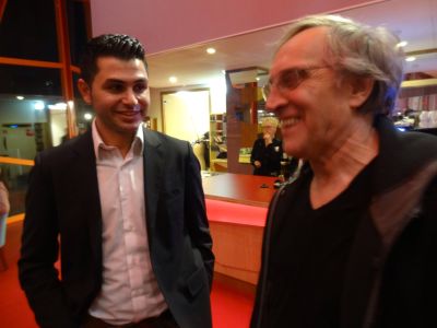 Omer Kaya, tegare met Freark Smink na afloop fan de foarstelling. Bewondering bij Kaya en opluchting bij Smink, na wear un slaagd optreden.