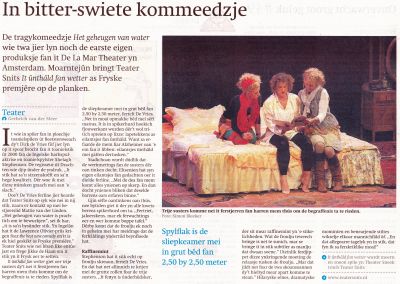 Moarn-en sneontejûn spilet Teater Snits it premjêrestik ' It ûnthâld fan wetter '. It is de oesetting ( Jikke de Haan ) fan de tragy-komeedzje ' Het geheugen van water '. Yn it Friesch Dagblad fan hjoed in moai artikel skreaun troch Gerbrich van der Meer. De foarstelling fan moarntejûn is stiif útferkocht, foar dy fan sneon binne noch in beheind tal tagongskaarten te krijen.