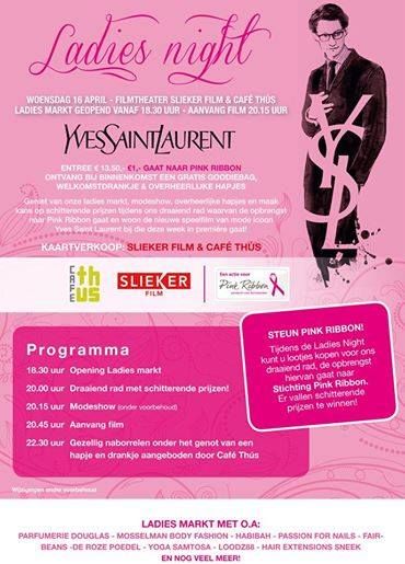 De opbrengst hiervan gaat naar Pink Ribbon. Douglas zal ook groots aanwezig zijn, zij promoten de nieuwe geur van Yves Saint Laurent. En daarnaast krijgt iedere bezoeker een mooie goodiebag. Verder gaat de film van groots mode ontwerpen Yves Saint Laurent in primeure bij Filmhuis Slieker gevestigd in het Fries Museum, hier mag de bezoeker ook naar toe. Kort om het wordt een super leuke avond!”