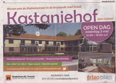 Wat ik ok un bitsje apart fyn is dat bij de advertênsy foar de Open Dag fan saterdach anstaande un art pression opnomen is sonder Teater Sneek. Fòlgens mij hoeve je je nyt te skamen foar dat stukje moderne arsjitektuur fan Sneek. Al weet ik om de bliksem wel dat de meningen hierover ferdeeld binne. Ut sumar fut late fyn ik op syn minst opfallend. Gelukkech staat op de site fan de Kastanjehof wel un echte foto met de teatertoren op’e achtergroan.