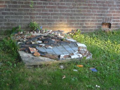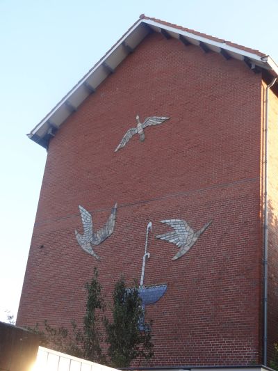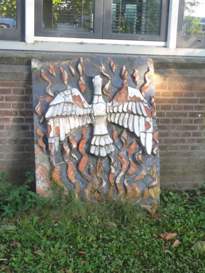 In bovenstaande info staat dat de “ aangebrachte keramiektableaus zijn inmiddels verdwenen ”. Dat is dus nyt waar. De tableau’s binne der nòch altyd, mar der wurdt absolút nyt op past. Een fan 4 werken is ondertussen an pún: “ Het alziend oog met zon, maan en sterren, tezamen het heelal uitbeeldend ”, is niks mear fan over. Siën bovenste foto.