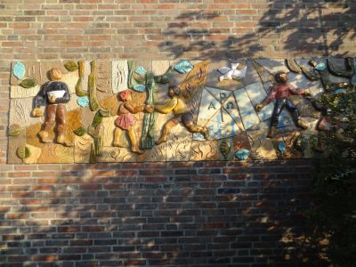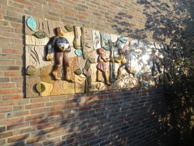 Op de muur fan de skoal brocht de Sneeker kunstenaares Cobie Doevendans un keramieken muurreliëf an. Dêrop un foarstelling fan speulende kyndes met de Bibel as middelpunt.