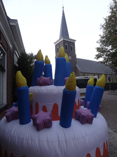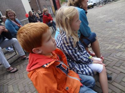 Stadsomroeper Jan Sjoerd de Vries leest opstellingen foar en maakt wear reklame foar de stad!