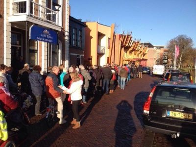 Un lange rij staat op de Westersingel ( en in ut Theater self ! ) in ut jannewarysontsje te wachten tòt de ferkoop fan de felbegearde kaartsjes los gaat.