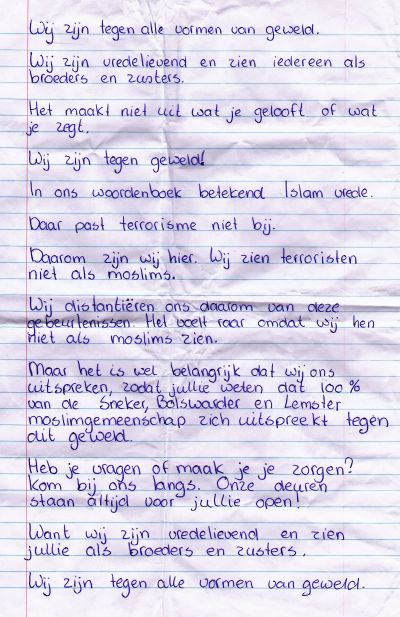 Maar het is wel belangrijk dat wij ons uitspreken, zodat jullie weten dat 100% van de Sneker, Bolswarder en Lemster moslimgemeenschap zich uitspreekt tegen it geweld.