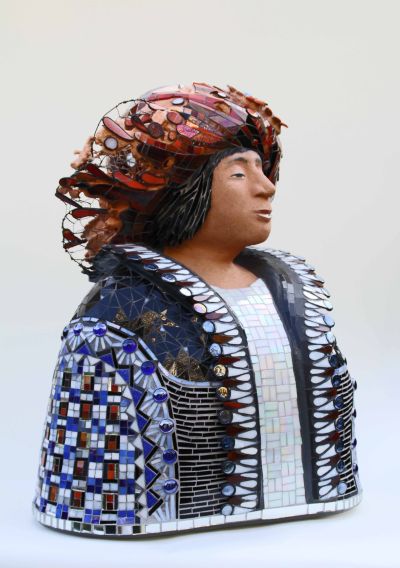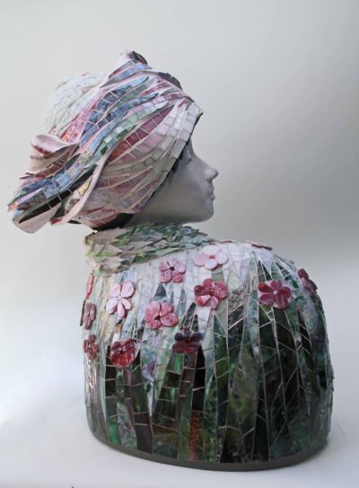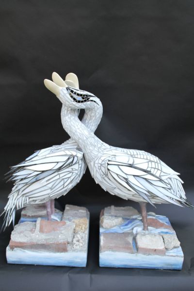 Een jaar of 10 geleden viel zij als een blok voor de mozaïekkunst. “Een kunstvorm waarmee maar weinig geëxposeerd wordt daar deze door veel gerenommeerde galerieën nog steeds geschuwd wordt. Zo niet de onze. Wij zien hierin een kunstvorm die in een lange traditie zijn zeggingskracht heeft gevormd, bewezen en behouden; van Romeins badhuis tot de expressie van Gaudí, Karel Appel en Niki de St. Phalle”, aldus galeriehouder Peter Bax. In deze kunstvorm werkt Nanne voornamelijk 3-dimensionaal: vrouwenbustes en vogels zijn favoriete uitingen van haar. “Zowel in mijn teken- als in mijn mozaïekwerk ben ik vooral geboeid door decoraties en ritmische patronen van bijvoorbeeld een verenpak of kleding (stofpatronen). Met behulp van de mozaïektechniek kan ik me daar heerlijk in uitleven” aldus Nanne Wilders. Regelmatig combineert zij de mozaïek-techniek met de tiffany-techniek. Een glaskunstvorm die Louis Comfort Tiffany in 1890 voor het eerst toepaste en die deze naar zichzelf heeft vernoemd. Het maken van haar beelden kost veel tijd; ongeveer 10 maanden. Het begint met het opbouwen van de vorm van een beeld en later het bekleden ervan met mozaïekmateriaal. “Breng een bezoek deze expositie en ontdek de kleurrijke objecten of verbaas u juist over de ingetogen sfeer van haar werk”, besluit Bax. Nanne Wilders is lid van het Mozaïekgilde, een vereniging van kunstenaars die zich inzet om mozaïek als autonome kunstvorm te promoten. Professionals die met mozaïek kunstwerken maken.