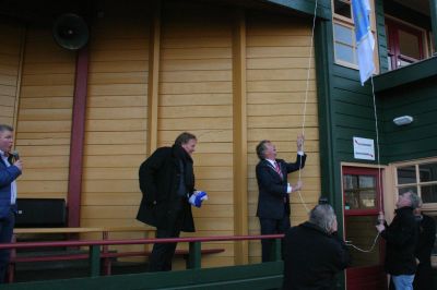 Fanmòrren fon ik in myn digitale pòstbakje twee foto's dy't ik hierbij graach plaats. Op de bovenste foto hijst burgemeester Hayo Apothker, tegare met Aeble ( ' Appy ')Bakker de júbileumflach. Links opperspreekmeester Niels Engelmoer.