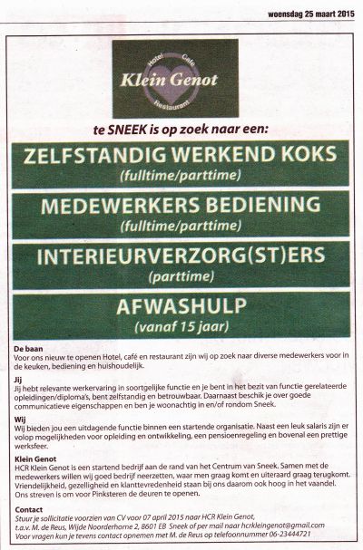 Fandaach staat in ut Sneeker Nieuwsblad un adfertênsy fan Hotel Café Restaurant Klein genot wêrin't de nieuwe útbater op soek is naar personeel.