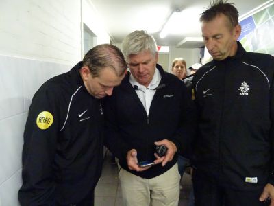 O.N.S. bestuurslid Jan Dijkstra en scheidsrechter Bronsvoort bestuderen de buienradar. Nergens meer voor nodig, het voetbalveld is een groot waterbassin waar op voetballen onmogelijk is.