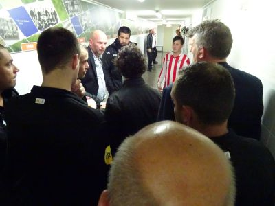 Scheidsrechter Bronsvoort te midden van de Vlissingers: 'mannen ik kan geen andere beslissing nemen...'