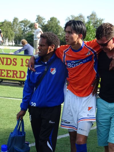 ONS verdediger Gustavo van der Veen, tussen verzorger Stefan Algra en vrijwilliger Paul Buma, moet geblesseerd het veld verlaten