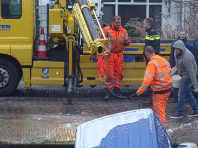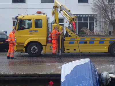 Even na 15.15 uur melding dat der un bestelbuske te water raakt was. Bestuurder kon der gelukkech self útkrúpe. Sterkte C.! De mannen fan Bergingsbedriëf Betten hadden der nòch un hele klus an om ut vehicle wear op de kade te krijen. Ut was namelek snòtterglad en der moest earst met sout/pekel strooid wurdde. Tip: Miskyn un reling plaatse?!
