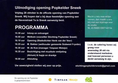 Fandaach 28 òktober is un memorabele dach foar de popkultuur fan Sneek, un dach om nyt te fergeten. Gyn Popbunker mar un Popkelder wurdt der fandaach offisjeel opend. Je súden ferwachte dat su’n offisjele opening deen wurdt deur iemand út de popscène, mar nee ut Stichtingsbestuur was lekker dwars en wú graach eentsje út de andere kulturele sektòr fan de stad.