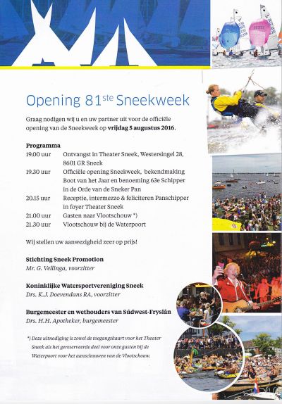 Nòch un paar weekjes wachte op de 81ste Sneekweek. Fanmòrren lach de útnoadeging bij mij op de kokosmat foar de offisjele opening fan de Sneekweek dy't dit jaar op frijdach 5 augustus is.