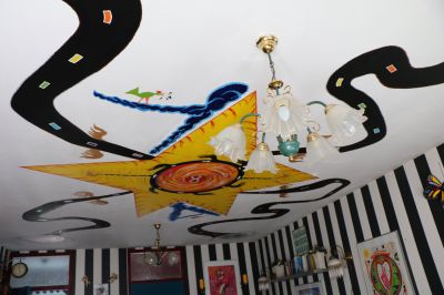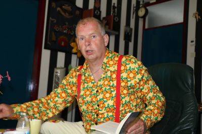 Ik moet meteen aan de fameuze naïeve schilder Ruurd Wiersma ( 1904 – 1980) uit Burdaard denken, als ik mijn voet over de drempel van Ronny Leistra zijn huis zet. Wiersm die van zijn woonkamer een groot geschilderd kleurig panorama maakte. Wanden, plafond, meubilair niets in het huis van de voormalige melkvaarder ontsnapte aan het penseel van Wiersma, een eerste klas zondagsschilder. Zo panoramisch is het bij Ronny Leistra nog niet, maar de schutting, het fietsenhok, de klompen, het plafond heeft inmiddels een kleurrijke metamorfose ondergaan door toedoen van de Sneker kunstschilder. Ronny Leistra is geen naïeve schilder, en als we dan toch een etiketje moeten plakken dan hoort Ronny meer thuis bij de Outsider Art groep. Het zijn kunstenaars die vaak een beetje ‘anders’ zijn, bij deze kunstenaars komt kunst rechtstreeks naar boven borrelen. Het werk van Ronny Leistra is uitermate boeiend, veelzijdig en vooral puur! Op kattebelletjes maakt hij aantekeningen en krabbels die hij later uitwerkt.