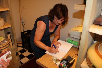 Zij heeft een boekje geschreven met de alles zeggende titel ‘Boter, Kaas en Eieren- een dag op de markt’. Ik heb het boekje als tussendoortje met smaak gelezen. Prachtig het verhaal van zo’n muts die voor de marktkraam staat alle ‘jammetjes en cutneys’bekijkt, ze keer op keer in de hand neemt. De appelstroop, de pruimenjam, de uienchutney, de honing, de perensap, de appelsap en de dubbelsap en alle combinatiejams die zij beleg noemden, zoals de aardbeienrabarberbeleg, het appel-kersenbeleg, het…kortom alles, alles had zij al vast gehad.