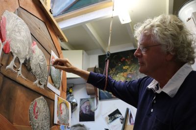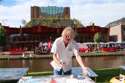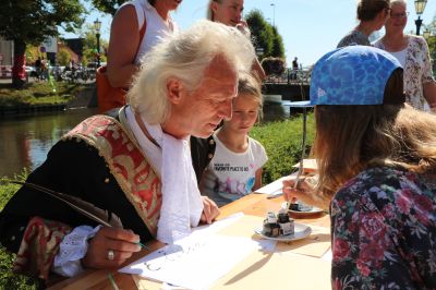 Hindeloopen- Vrijdagmorgen opende de bekende acteur Freark Smink in aanwezigheid van een grote schare Hylper schooljeugd op meeslepende wijze, rijdend op een skelter - de expositie van het werk van Anna Sikkes in Museum Hindeloopen. Dat de maand oktober in Museum Hindeloopen ook kindermaand is, daar liet Freark in zijn openingsact geen twijfel over bestaan! Anna Sikkes is geboren en getogen in Hindeloopen (Hylpen).