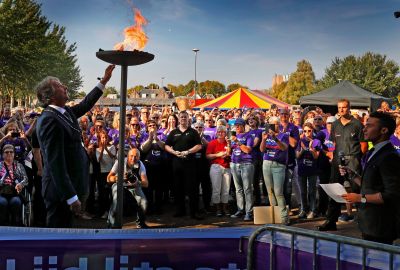 Burgemeester Hayo Apotheker van SWF heeft vanmiddag om 16.05 uur, na een aantal woorden van hoop en bemoediging, de Vlam van Hoop voor de Samenloop voor Hoop Sneek/SWF ontstoken. Daarna begon een groep van Eregasten, mensen die getroffen zijn of waren door kanker aan de loop over het Veemarktterrein.