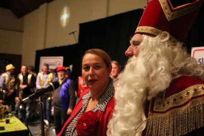 Burgemeester Hayo Apotheker, druk bezig met zijn afscheidstournee, had de moeite genomen om het feest bij te wonen. Hij bedankte niet alleen de 70-plussers die aanwezig waren voor de geweldige tijd die hij in Sneek had gehad als burgervader, maar hij zong samen met een van de Pieten ook nog eens uit volle borst ‘Ut Woanskip’ voor de enthousiaste zaal.