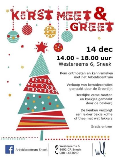 Sneek- Net als voorgaande jaren zijn de medewerkers van Arbeidscentrum Sneek al weer druk bezig met het produceren van kerstproducten. Graag helpen wij het Arbeidscentrum om wat reklame te maken: “Kom ons bezoeken en ontmoeten tijdens onze gezellige ‘Meet and Greet’ in het activiteitencentrum in Sneek. Wanneer: donderdag 14 december van 14.00 tot 18.00 uur Waar: Arbeidscentrum Sneek, De Westereems 6.