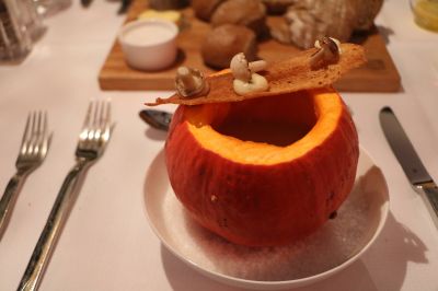 De knolselderijsoep, met zuurdesembrood & paddenstoelen worden op een hele creatieve manier geserveerd in een heuse pompoen. Het tussengerecht dat op de onzichtbare kaart staat is gepofte aardpeer met oude kaas en havergort.