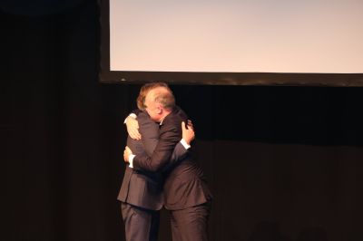 Sneek- In een bomvol Theater Sneek is Hayo Apotheker vanmiddag bij zijn afscheid als burgemeester van SWF benoemd tot Officier in de Orde van Oranje Nassau. Nadat de commissaris van de koning Arno Brok de scheidende burgemeester de versierselen had opgespeld gaf hij Apotheker een dikke knuffel.