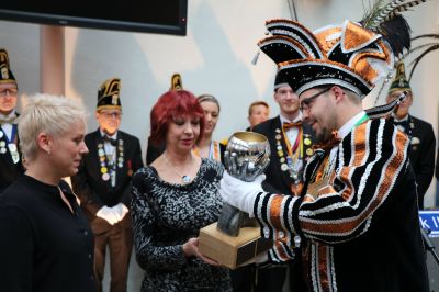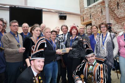 Sneek- De jubileum Aggemabokaal van cv De Oeletoeters ( de dertigste keer)uit Sneek is vanmorgen uitgereikt aan de organisatie van de Samenloop voor Hoop. De beide initiatiefneemsters, Cindy Neyens en Ellen Bouius, mochten de bokaal, die elk jaar uitgereikt wordt aan een persoon of een groep die het afgelopen jaar een positieve bijdrage heeft geleverd aan de Sneker gemeenschap, in ontvangst nemen van Prins Hendrik de Tweede.