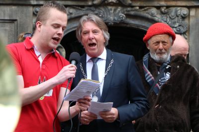 Waarschijnlijk door de vroege meivakantie was er minder publiek in de Marktstraat aanwezig dan in de voorgaande jaren. Gezellig was het wel en er werd weer volop meegezongen onder leiding van clown Sander, die op vlotte manier de aubade presenteerde.