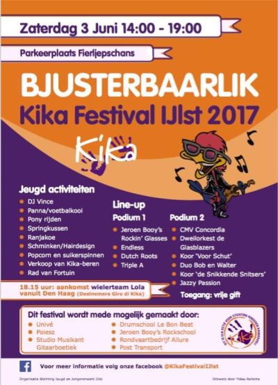 ‘Het inzamelen van geld voor vernieuwend onderzoek en andere activiteiten op het gebied van kinderkanker, gericht op minder pijn en strijd, meer genezing en een hogere kwaliteit van leven op latere leeftijd.’ Dit zijn de doelstellingen van Stichting KIKA (kinderen kankervrij) én van het Bjusterbaarlik KIKA festival IJlst dat op zaterdag 3 juni (tijdens de Overtuinenfair) wordt gehouden op het parkeerterrein van de fierjlepaccommodatie en het Honk in IJlst.