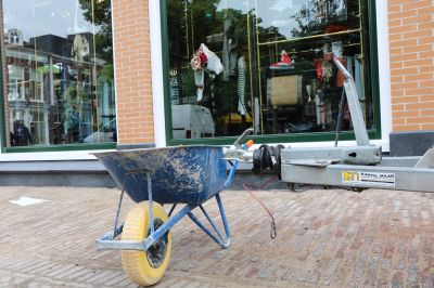 Ik kond niet wachten ( 'nee ik hew gyn andelen, ik promoat de stad allienech')tot de officiële opening van zaterdagavond acht uur en schoten ondertussen een aantal foto’s in de winkel. Buiten stond vanmiddag om half drie nog een kruiwagen, symbolisch voor dat alles nog hagelnieuw is. Maar wel in een zeer vertrouwd Sneker jasje!
