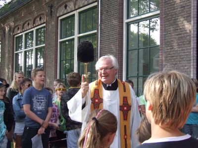 Fanmòrren het pastoar Peter van der Weide de nieuwe dependance fan de Sint Bonifatiusschool Bonnetop insegend. Fia maat Kees Poiesz kreech ik enkele fraaie foto’s fan dizze plechtechheid. Skoal staat, prachtech restaureard an de Looxmastraat.