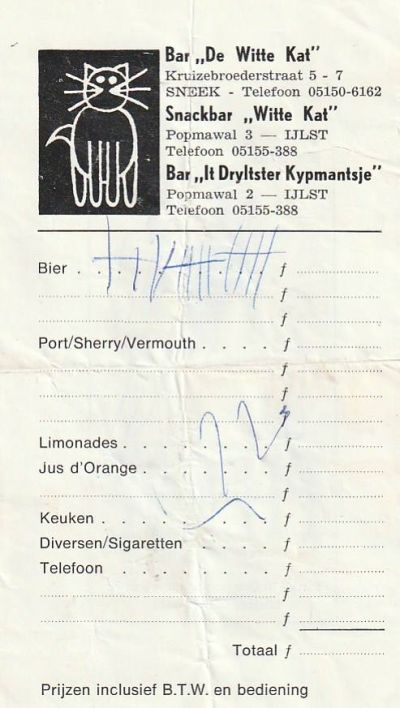 In een fan dy ‘Ryam’s’ fon nyt allienech antekeningen, mar ok un rekening wat ik op un avend in de Witte Kat opsoop. ‘k Fyn su’n kaartsje gewoan un moai besit. Op’e achterkant had George Brandsma un advertearder. Ok dat is un moai tydsbeeld.