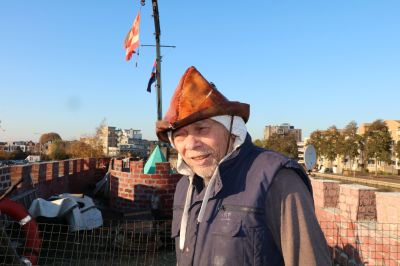 Als ik kom aanfietsen bij het voormalig Flexaterrein ligt het museumschip al aan de wal. Ik ben meteen onder de indruk van het toch wel opzienbarende varende museumkasteel Vlotbrug. Mijn verbazing zal gedurende de ontmoeting met Len Vries, ‘de kasteelheer’ alleen nog maar toenemen. Ik heb mijn komst niet van tevoren aangemeld, maar Len ontvangt mij allerhartelijkst. Een Surinaamse man met een Robin Hood-achtige leren hoed op zijn hoofd, waaronder twee pretoogjes voortdurend lachen.