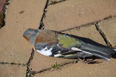 Foto hew ik foarege week in Earnewâld nommen. Fogeltsje (fink?) was teugen un rút anflogen. Het ut dus nyt overleefd. Poatsjes omhooch, is noait goëd bij un fogel. Bij minsen is ut met de neus omhooch nyt goëd.