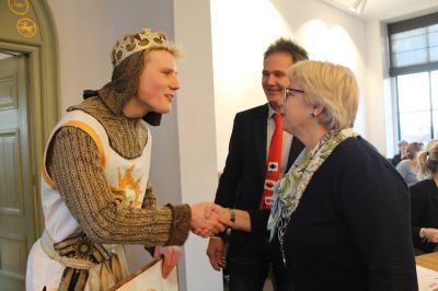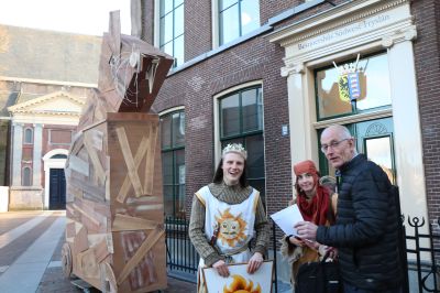 Voor de nodige publiciteit wachten twee acteurs gisteravond de raadsleden van de gemeente SWF op voor het Bestjoershûs. Ook de levensgrote konijn was aanwezig bij de ingang van het bestuurscentrum. Burgemeester Magda Berndsen kreeg in de raadzaal een Flyer van King Arthur! (Foto hieronder van Casper Ferwerda)