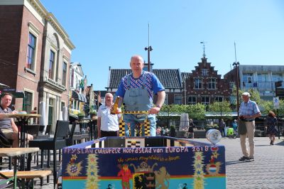 Sneek- Al waren we weer terug in de Flower Power tijd! Ronny Leistra, eigenzinnig kunstenaar uit Sneek heeft even na halfeen vanmiddag z’n prachtig geschilderde bakfiet Unit Bike of Freedom KF2018 gedoopt. Hij deed dat op het terras van de Ierse Pub met een fles Grutte Pier Bier: “Ik wil deze kunstbakfiets openen voor de Europese Youth Musical Festival 2018 At the Watergate Fryslân Culturele hoofdstad van Europa. Plopppp… And boppe!! Ik doop deze fiets for the love of the holy gost!”