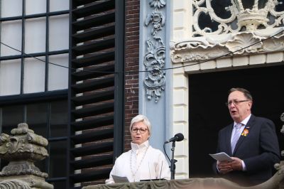Sneek- Waarnemend burgemeester Magda Berndsen ( en niet zoals in het overigens netjes verzorgde programmaboekje staat ‘Bernsen’ !) heeft vanmorgen vanaf het bordes van het stadhuis aan de Marktstraat de traditionele aubade afgenomen. Een paar honderd belangstellenden, waaronder ook veel jeugd zongen uit volle borst onder begeleiding van de Putkapel de bekende meezingers als de Zilvervloot, West-Zuidwest van Ameland en uiteraard It Frysk Folksliet en het Wilhelmus. De Putkapel viert dit jaar haar zilveren jubileumfeest.