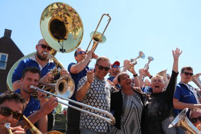 Wat een geweldige sfeer door toedoen fan de Heegemer Dekdweilers, die het publiek en de renners regelmatig ‘gek genoech’ krijgen om mee te swingen. De muzikale sfeermakers schromen niet om tussen de wachtende fietsers een polonaise in te zetten, zelf op de klinkers te gaan liggen en ondertussen iedereen muzikaal opzwepen. Het lukt allemaal wonderwel.
