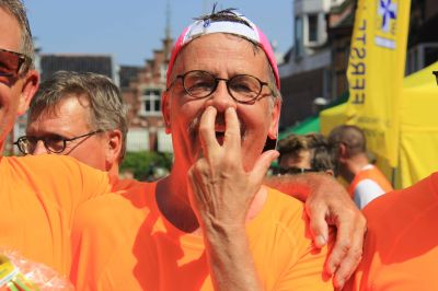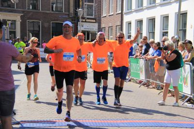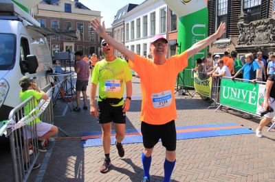 En hieltyd mar wear de anmoedigingen! Deurgaan! Jum bin der hast. Set’um op mannen. Klasse! En Age en ik mar lache! Peter was al in gyn felden òf wegen mear te bekennen. Ut tweede rondsje, op ut Bolwerk na ( binne we op de Alp d’Huez…) ut Oud Kerkhof foëlt as un befrijding en de Marktstraat? Wat un ontfangst, wat un euforys moment om na su’n bloëdhite 4 Mijl over de streep te gaan.