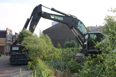Vandaag is een kraan geplaatst en vanaf vrijdag zal gestart worden met het rooien en afvoeren van de grotere struiken. Vanaf maandag zal met het verwijderen van oude muurdelen worden aangevangen. Aansluitend zal er grond en puin worden afgegraven, worden afgevoerd en zal er nieuwe grond aangevoerd en ingereden worden.