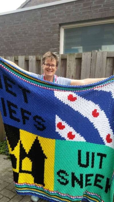 Akkelien Smink maakte een ontwerp voor een Sneek-deken. Ze haakte 'm ook en inmiddels is de deken in Leeuwarden en kreeg nummer 10.041. Al ruim langs de 10.000, het record is bereikt. Op 14 en 15 juli zullen alle dekens in Park Vijversburg in Tytsjerk liggen.