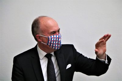 De coronaregels zorgden er vanmiddag voor dat de genodigden, waaronder de samenstellers van het boek, getooid met mondkapjes bij Lokaal 55 zaten waar de aanbieding plaatsvond. Arno Brok uiteraard met ‘ Fryske flach mûlkapke’ en Jannewietske de Vries met een bruin exemplaar, passend bij haar jurk die ze deze middag droeg.