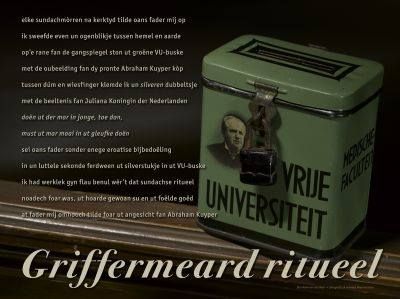elke sundachmòrren na kerktyd tilde oans fader mij op ik sweefde even un ogenblikje tussen hemel en aarde op’e rane fan de gangspiegel ston ut groëne VU-buske met de oubeelding fan dy pronte Abraham Kuyper kòp tussen dúm en wiesfinger klemde ik un silveren dubbeltsje met de beeltenis fan Juliana Koningin der Nederlanden doën ut der mar in jonge, toe dan, must ut mar moai in ut gleufke doën sei oans fader sonder enege eroatise bijbedoëling in un luttele sekonde ferdween ut silverstukje in ut VU-buske ik had werklek gyn flau benul wêr’t dat sundachse ritueel noadech foar was, ut hoarde gewoan su en ut foëlde goëd at fader mij omhooch tilde foar ut angesicht fan Abraham Kuyper
