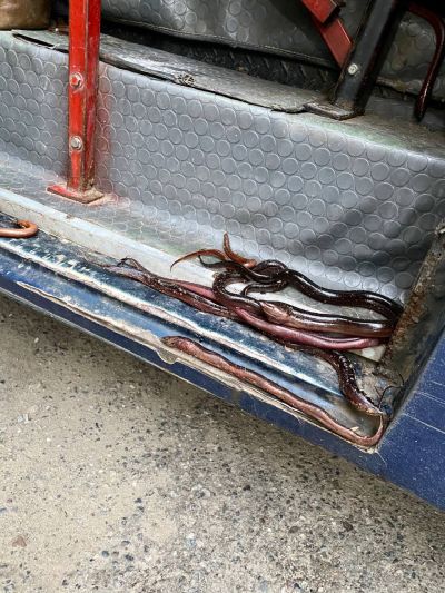 Als de motor van het busje uitgaat en de chauffeur even rustig gaat eten horen we voor en achter ons het glibberende geluid van honderden palingen. We schijnen met een zaklamp op de Jerry Cans en zien dat er kleine openingen aan de bovenkant zitten. Twee tellen later blijkt dat het label “te groot” beter op zijn plek is: er kruipen twee alen over de vloer! Ik trek de chauffeur boven z’n bord nasi vandaan en denk in de middle of nowhere na over een alternatief.
