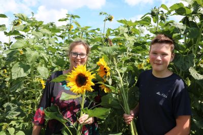 “Wij zijn begonnen met het plaatsen van zonnebloemen rond het maisveld. Daarmee voorkom je dat roeken vanaf de zijkanten in het gewas begonnen te pikken. De zonnebloemen zorgen er dus voor dat de maiskolven letterlijk op een mooie manier bescherming bieden. Nadat dat gelukt was, kwamen we al snel op het idee om de zonnebloemen te verkopen. We knipten ze zelf en brachten de boeketten naar de winkels bij ons in het dorp. De volgende stap was om bezoekers zelf de gelegenheid te geven de zonnebloemen uit te laten zoeken en af te knippen, drie stuks voor een euro. En er staan er genoeg.”