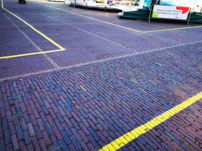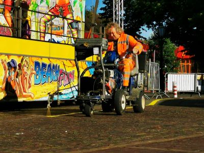 Fanmòrren wurde de gele lijnen anbrocht en wie anders as Jan Douwe Gorter lei ut fast. Ik weet nou al dat ut histoarise foto’s binne. Gisteravend ut terras op weest, bij Onder de Linden, su’t ik dat elk jaar op de donderdachavend foar de Sneekweek doën.