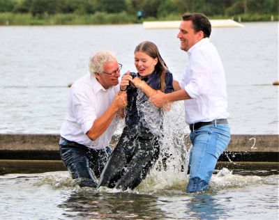 Eerder doopte dominee Wouter Bandstra van de Baptisten Gemeente in Sneek al eens een gemeentelid in de Sneker Boategoat. Dat was op 18 juni 2017. Vanmorgen hield de Evangelische Gemeente Sneek een doopdienst op het Pottenstrand, waar maar liefst 24 mensen, waaronder een groot aantal jongeren, zich door onderdompeling liet dopen. Het werd een bijzondere gebeurtenis: Als de Potten de Jordaan wordt!
