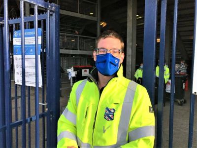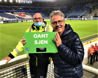 Stewards met SC Heerenveen moankapkes foar! Disiplineard in de rij staan! In ut stadion mear as genoech oustaan fan mekaar. Ut Frys fòlksliet diskear út de lúdsprekers, sach dat Syb van der Ploeg opnommen was op de middenstip!